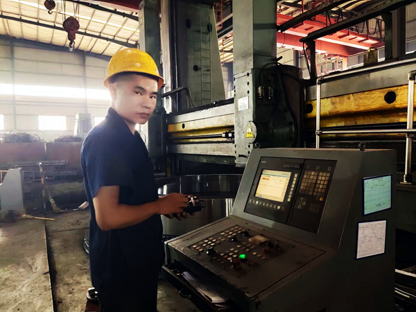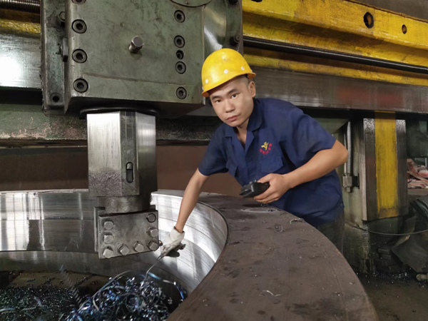他為人憨厚老實,吃苦耐勞,服從安排,任勞任怨,做事專注細致,被張主任看在眼里記在心里。因此當8米立車一名師傅辭職后,他便按照“量才配崗”的原則,立即把趙江調(diào)到立車崗位,每天親自教他操作立車。通過他的嚴格要求,加上趙江堅持不懈的努力,他終于熟練掌握了立車的操作技術。如今,他在立車崗位上己經(jīng)做了兩年,前后己帶了兩位徒弟。每當同事夸他上手快時,他卻覺得自己的技術離師傅還有很大差距?!凹埳蠈W來終覺淺,絕知此事要躬行。張主任的親自教導、我從書本上自學來的知識,自己按條條框框操作,這是打基礎。領悟了圖紙的加工要求后,在保證質(zhì)量的前提下,編寫好程序、各項參數(shù)、速度(包括進給速度和轉速)后,我還必須隨時觀察車床上的一舉一動,監(jiān)管加工全過程,在工作實踐中不斷發(fā)現(xiàn)問題、思考問題、解決問題、總結經(jīng)驗。當我能對具體問題具體分析具體解決并游刃有余時,我就從操作工變成師傅了,”趙江說。